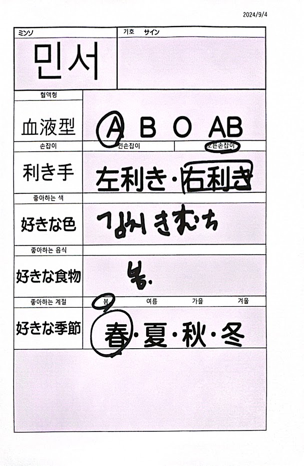 | あいさつ | マンネ、ミンソで~す。 |